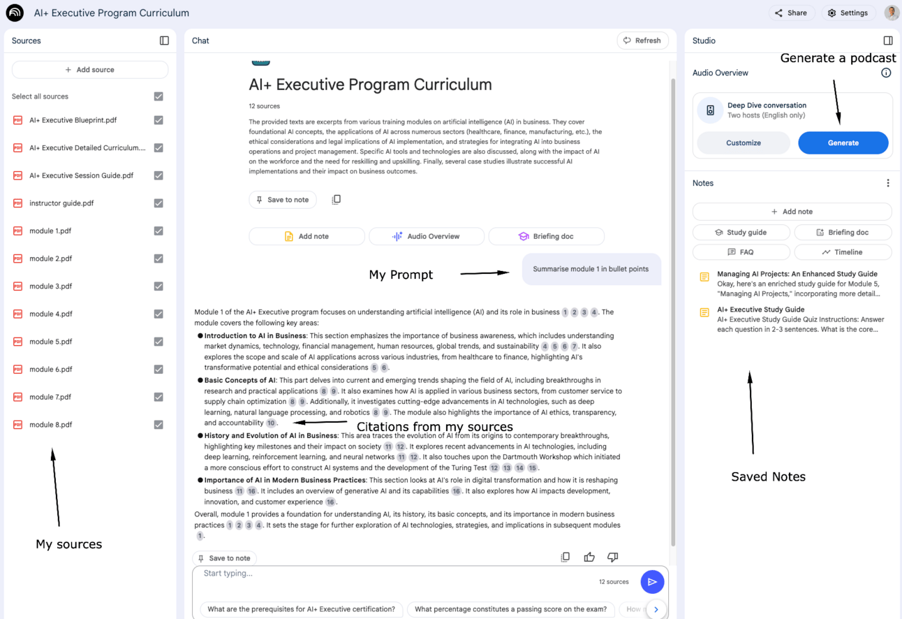 The tool focuses entirely on your uploaded sources i.e. it “grounds” the replies to your sources. It doesn't pull information from the internet. Whether it’s a PDF, audio file, or Google Doc, the tool grounds its work in the materials you provide. This keeps responses specific and relevant and with less probability of providing inaccurate information.